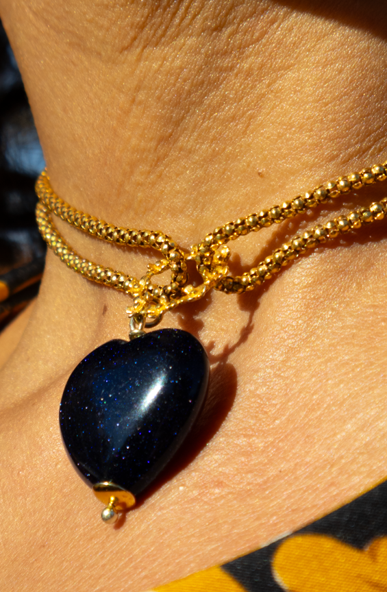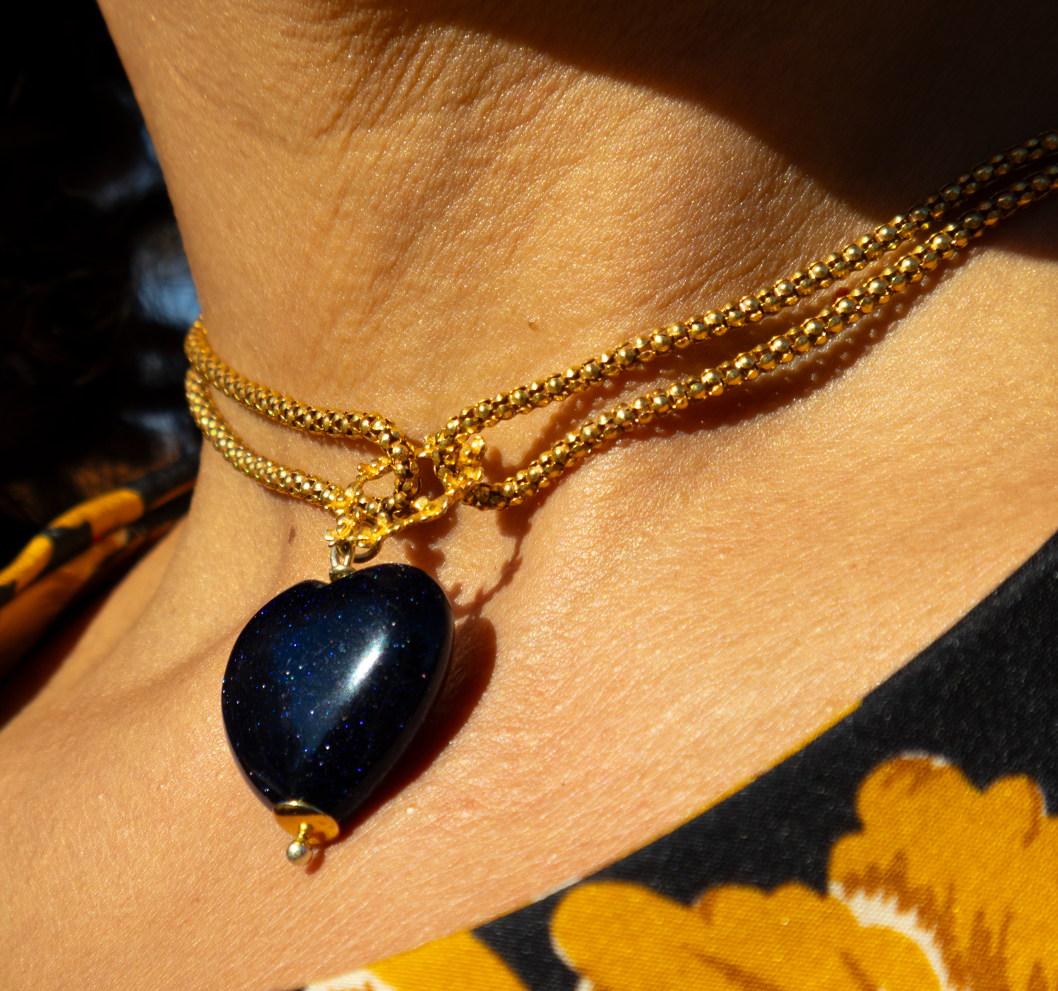 "Este colar tem uma presença incrível ao vivo. A combinação das pedras com o elemento central dourado é muito harmoniosa."
