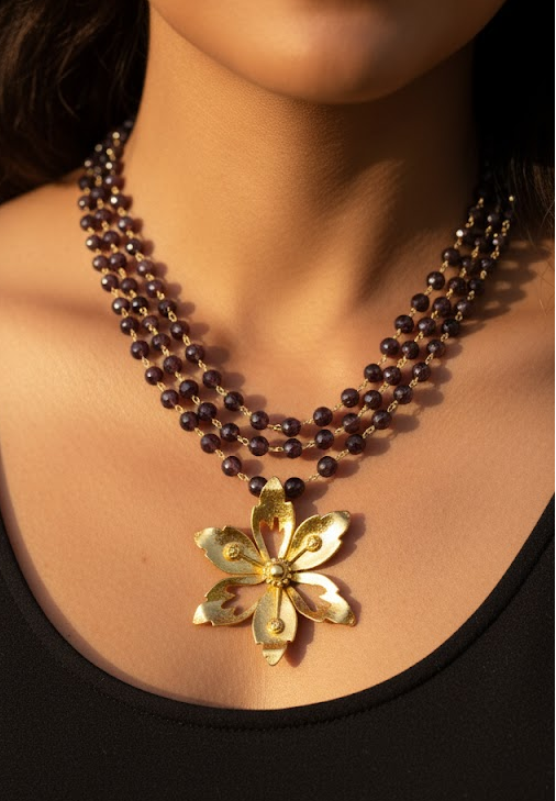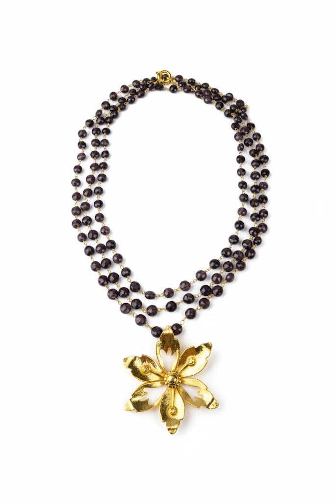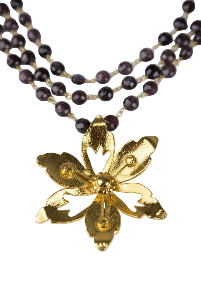 Um colar que celebra a natureza em seu estado mais puro e elegante. Esta peça combina o romantismo de uma flor meticulosamente trabalhada com a paixão intensa das granadas facetadas, criando um visual de sofisticado equilíbrio.