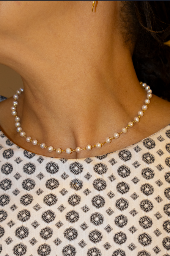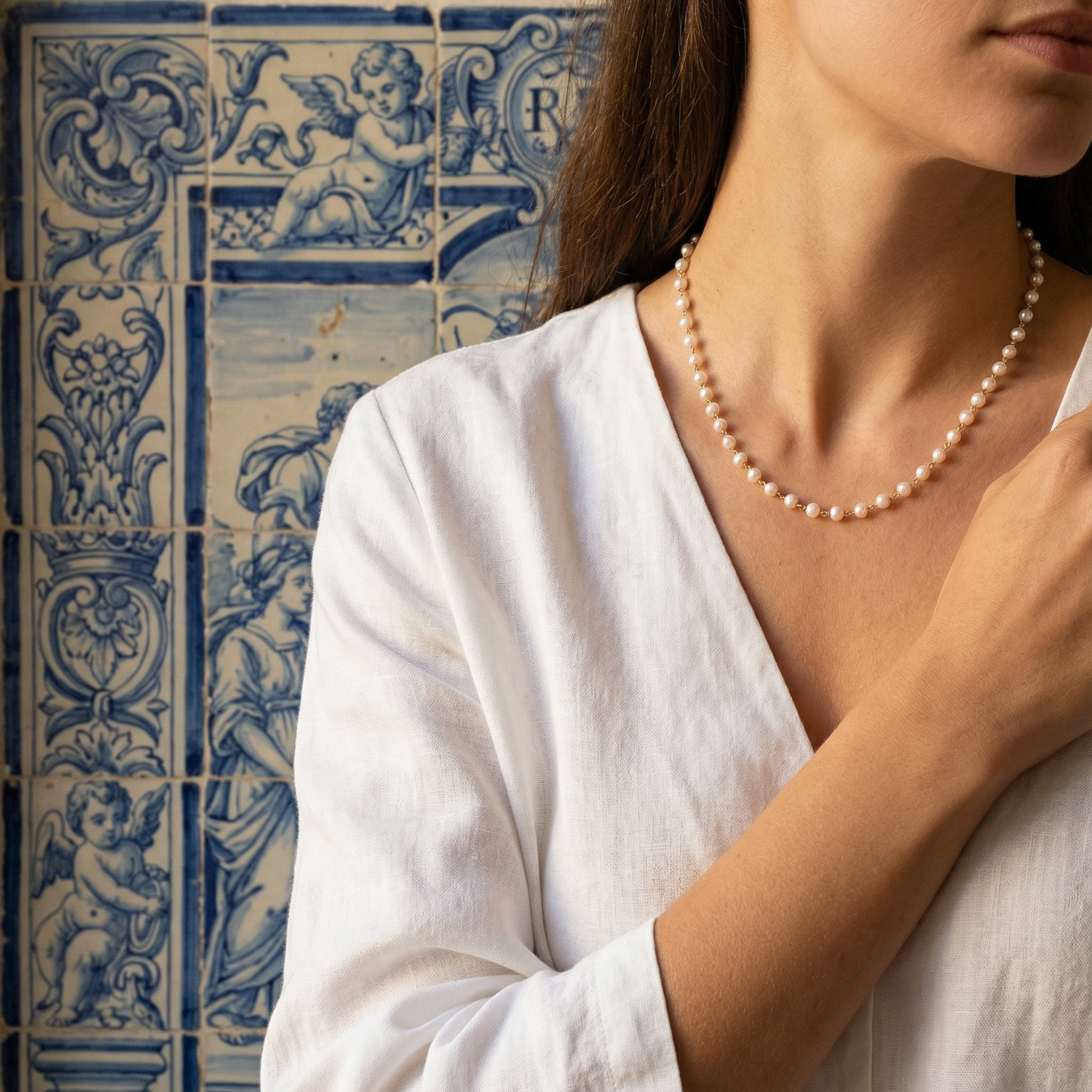 "Escolhi este colar pela simplicidade e fiquei muito satisfeita. As pérolas têm um tom suave e uniforme, e o colar assenta muito bem no pescoço."