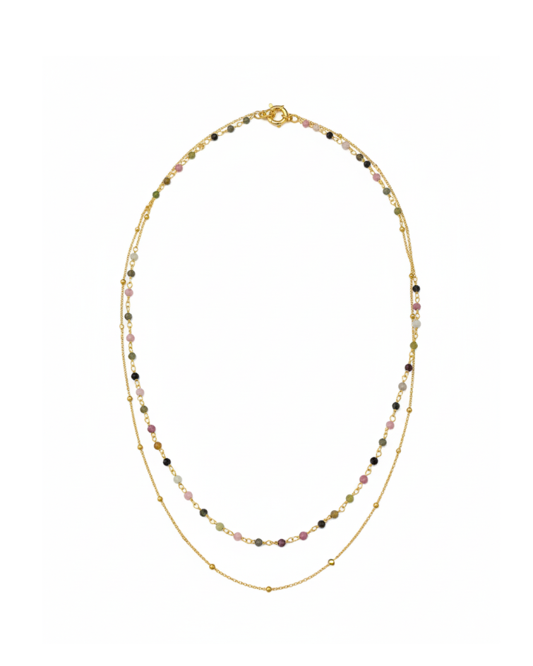 Este colar é uma sinfonia de cores e luz, onde a intensidade das Turmalinas encontra a pureza lunar da Prata 925. Cada pedra facetada captura e reflete a luz, criando um efeito hipnotizante de profundidade e movimento, com tons que variam entre o verde-floresta, o azul-profundo e o rosa-crepúsculo.