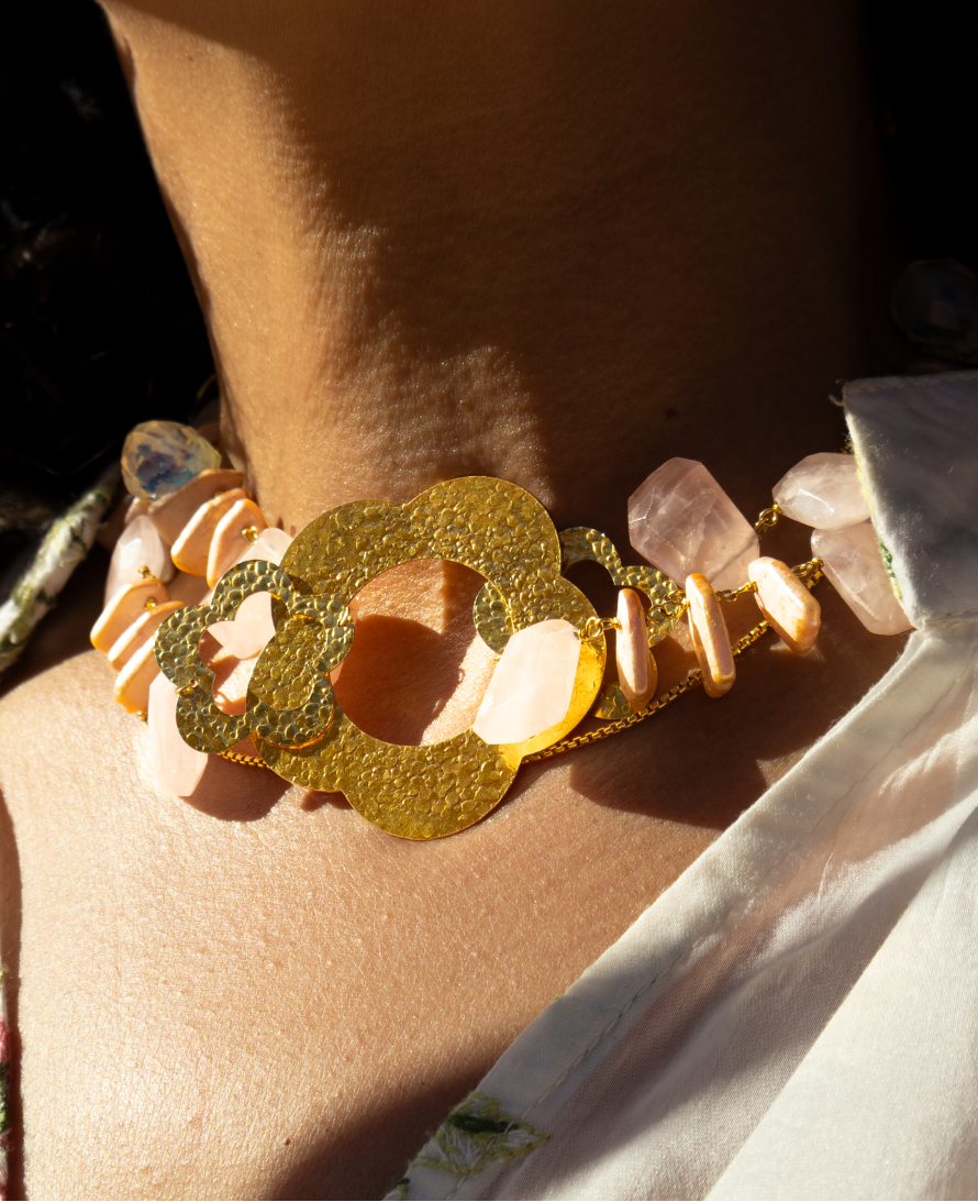 "Este colar tem uma presença incrível ao vivo. A combinação das pedras com o elemento central dourado é muito harmoniosa."